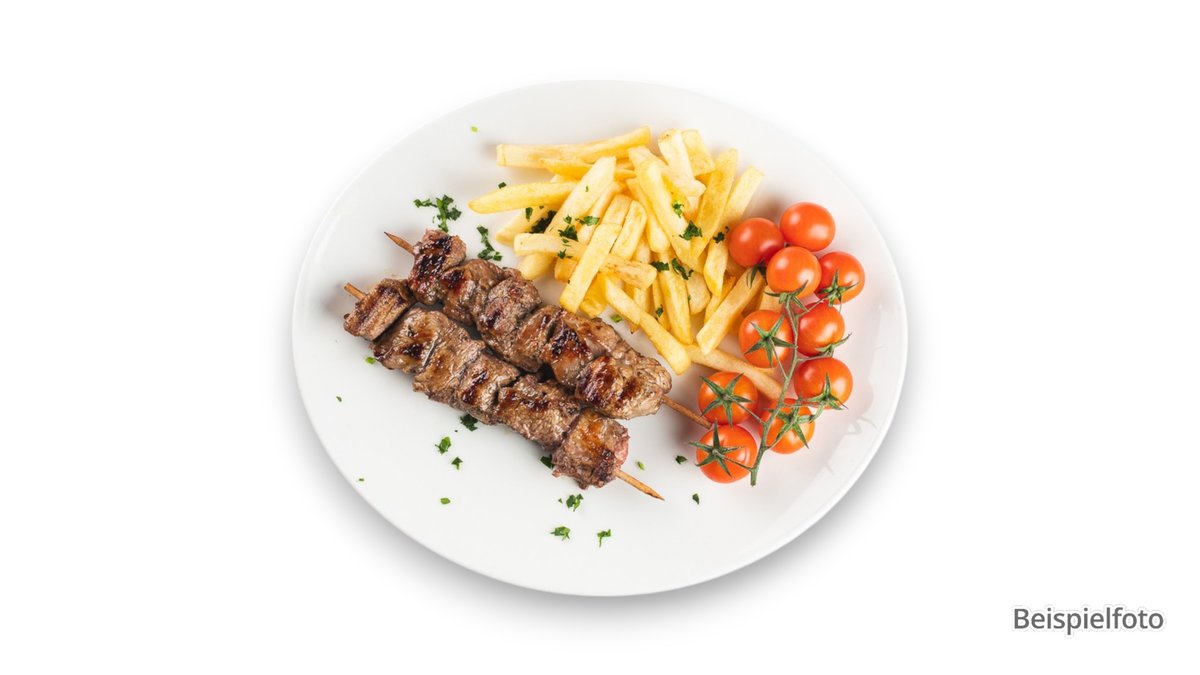 zwei traditionelle GrillspieĂźe vom Lamm, dazu Safranreis und Salatbouque