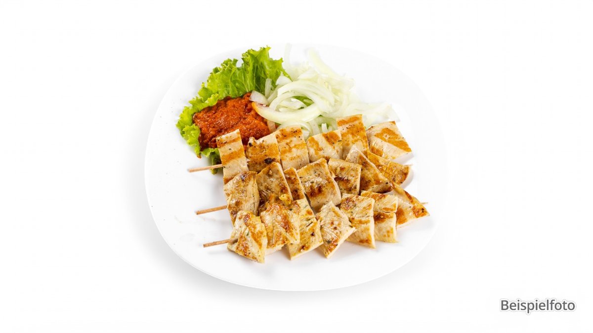 zwei traditionelle Grillspieße- Hähnchenbrustfilet, dazu Safranreis und Salatbouque