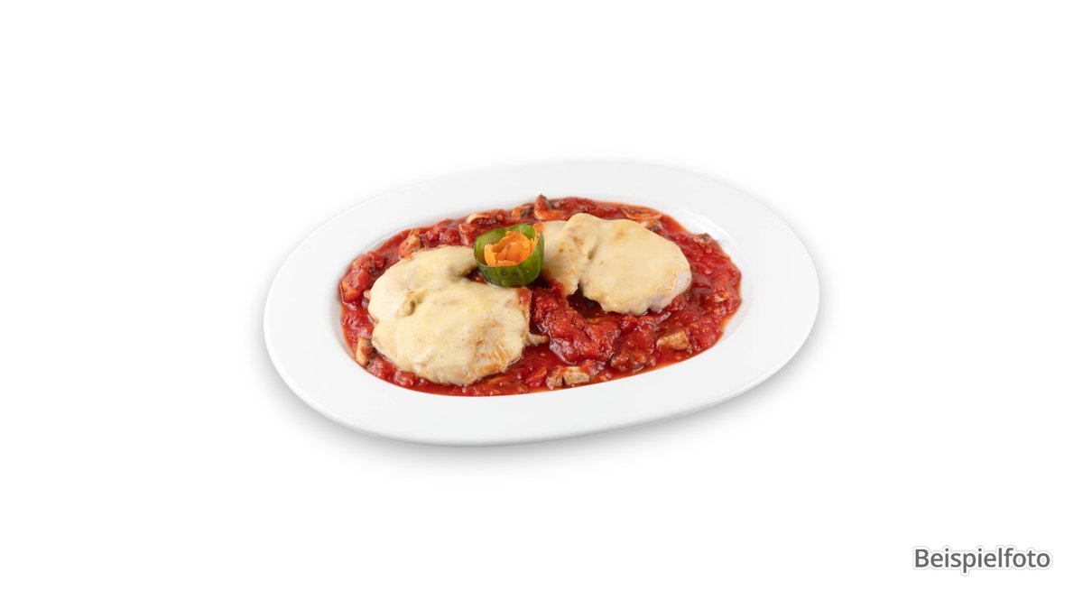 zartes Hähnchenbrustfilet in feiner Tomatensoßee, dazu Safranreis und Salatbouquet