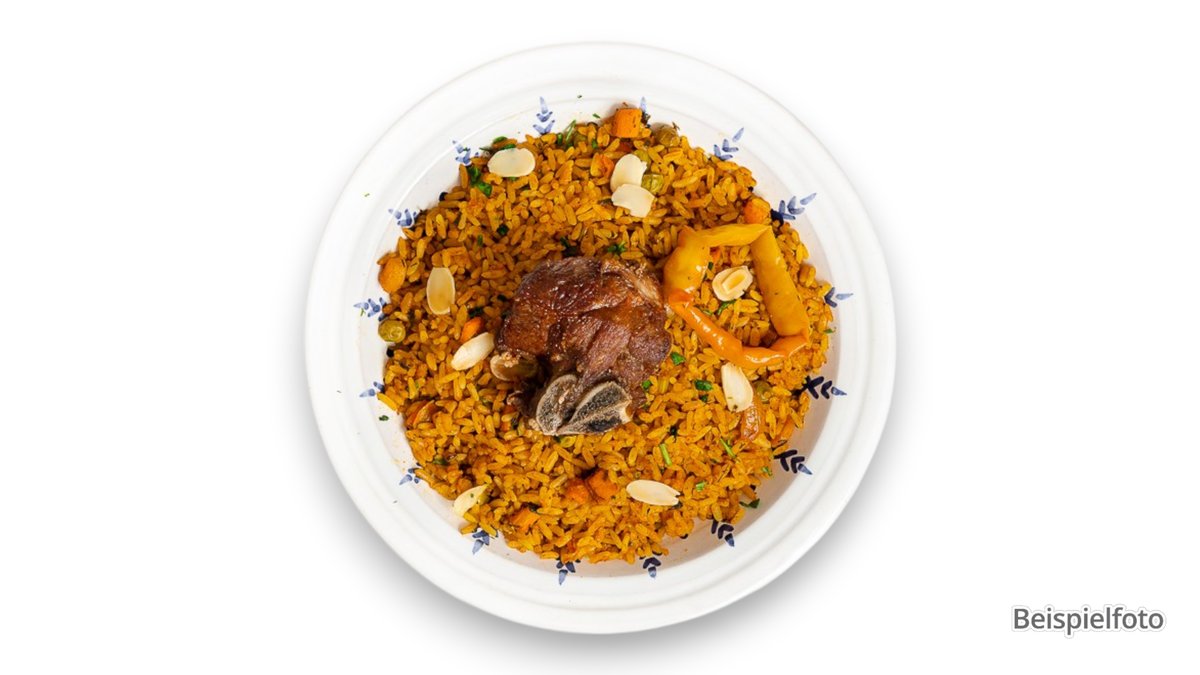 Mischung aus Fleischspezialitäten vom Rind, Lamm und Hähnchen und vegetarischen Köstlichkeiten, dazu Safranreis
