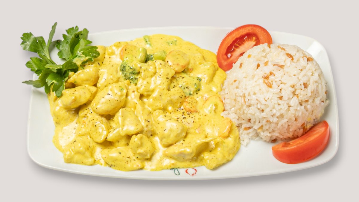Hähnchenfleisch mit Currysoße und Gemüse aus der Pfanne