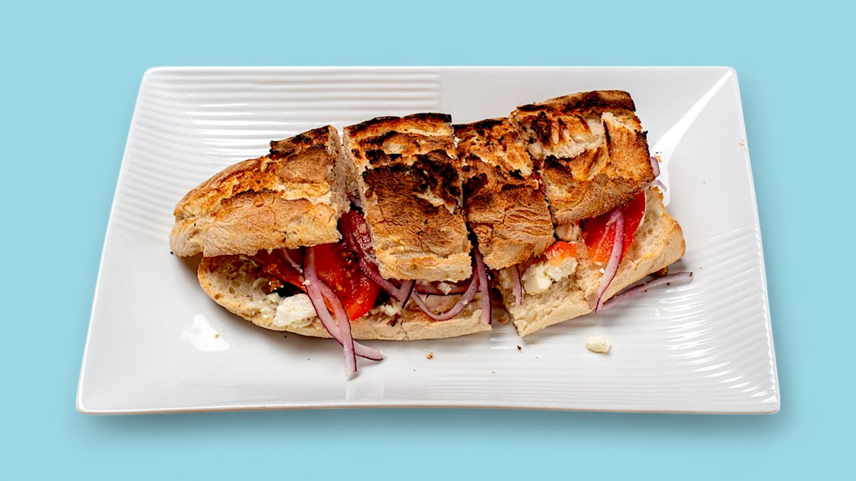 mit Schafskäse, Oliven, Peperoni, Tomaten und roten Zwiebeln