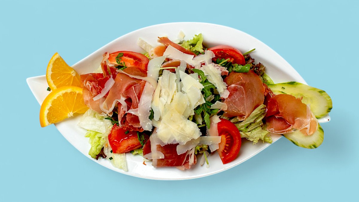 mit Serrano-Schinken, geriebenem Parmesan, Rucola, Tomaten, Croûtons und knusprigem Baguette