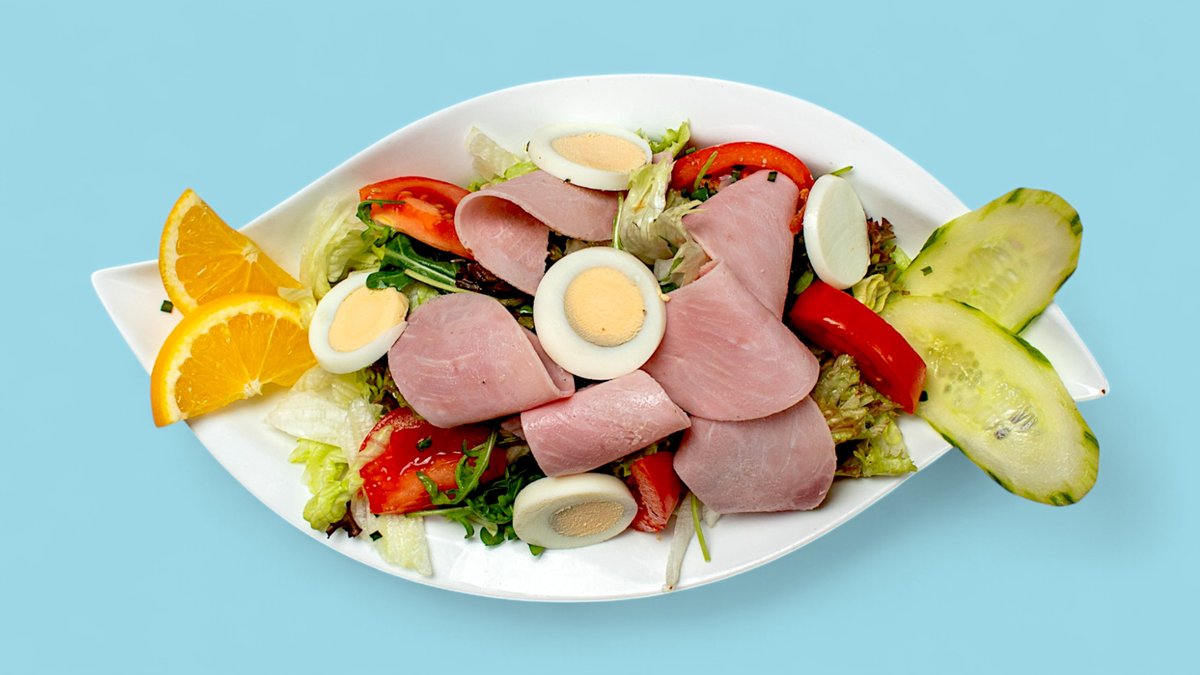 mit gekochtem Schinken, frischer Ananas, Käse, Curryaufstrich und Salat
