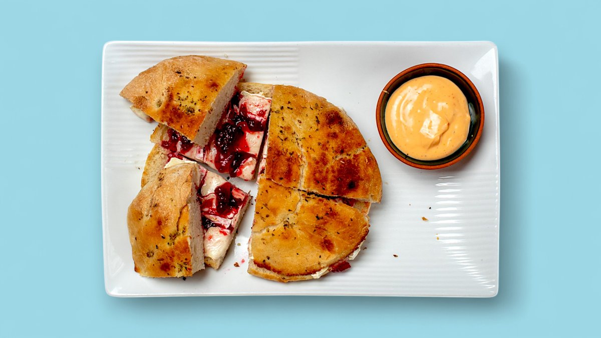 scharf mitgebratener Hähnchenbrust, süßer Chili-Dip, Frischkäse, bunten Paprikastreifen und Salat