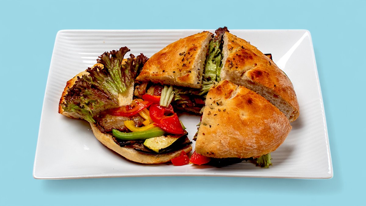 mit Auberginen, Zucchini, Tomaten, Paprika und Salat