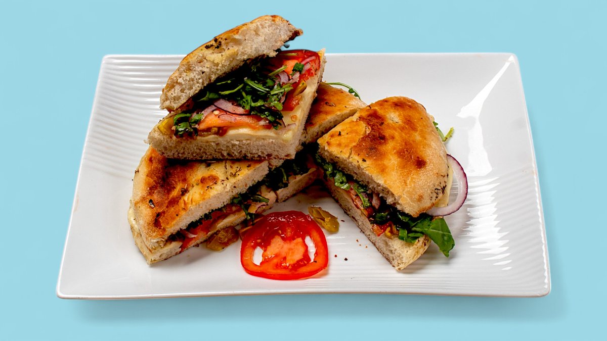 mit Mozzarella, Peperoni, gebratenen Champignons, Tomaten, Rucola, geriebenem Parmesan und knusprigem Baguette