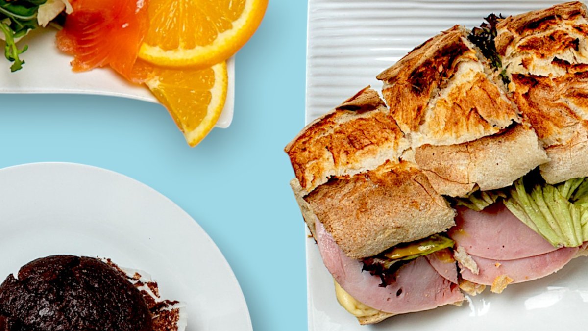 mit gekochtem Schinken, Ei, Tomaten, gebratenen Champignons, Croûtons und knusprigem Baguette