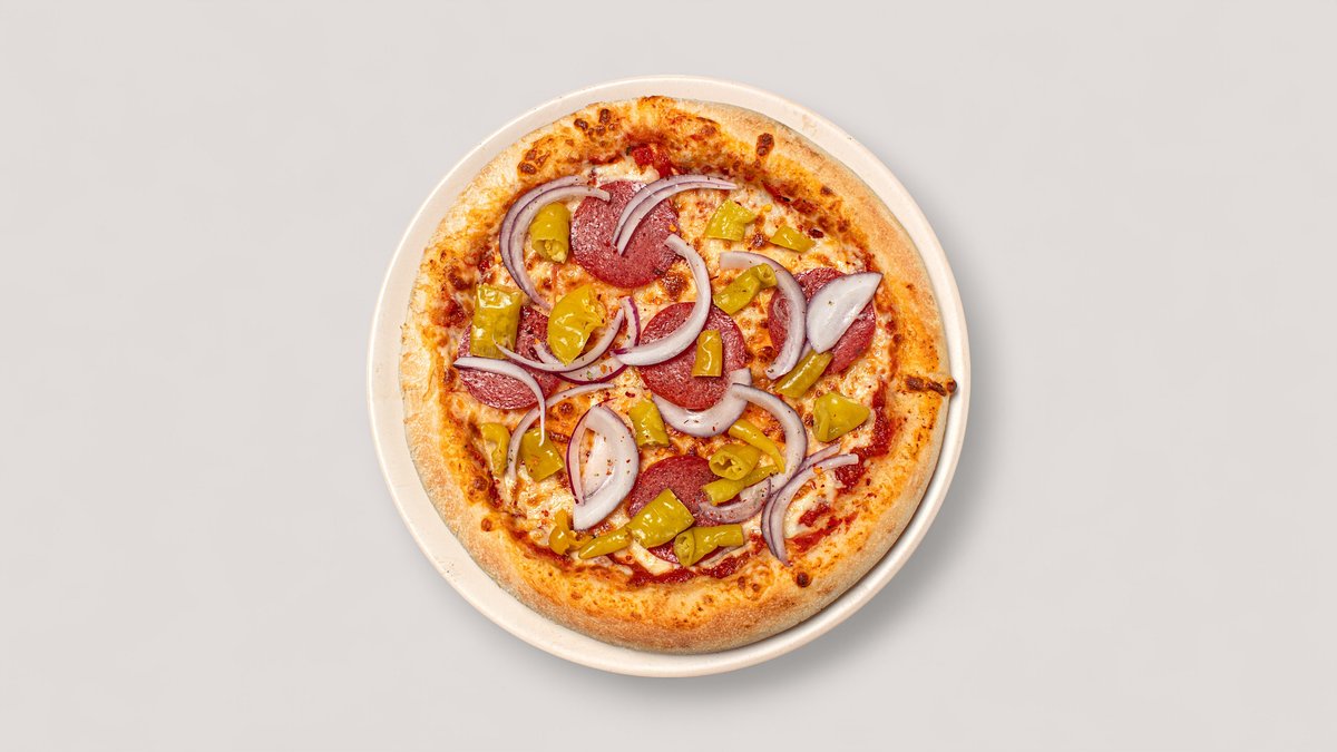 scharf mit milder Peperoni, Zwiebeln, scharfer Rindfleischsalami und Knoblauch