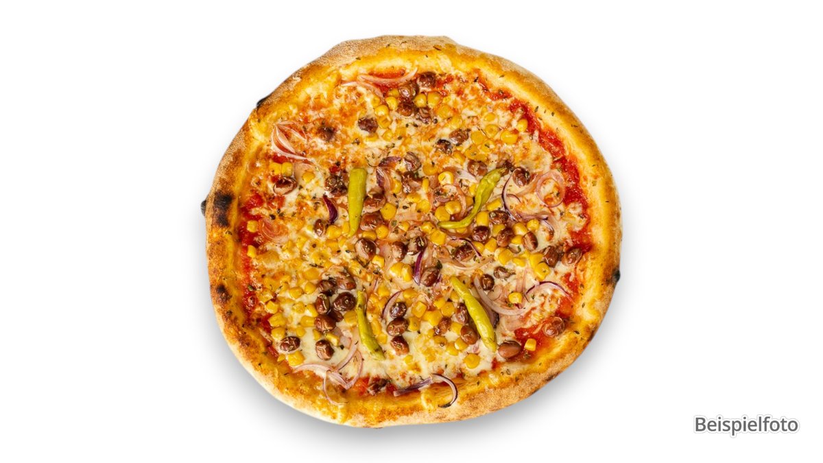 mit Tomatensoße, Käse, Rindersalami, Rinderpeperoniwurst, Schinken vom Rind, Paprika, Zwiebeln, Champignons, Mais, Oliven und extra Käse