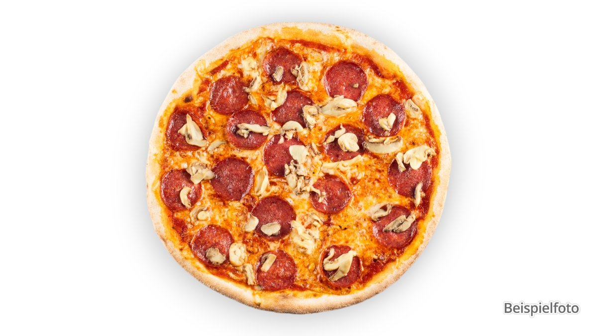mit Tomatensoße, Käse, Putensalami, Schinken vom Rind und Champignons