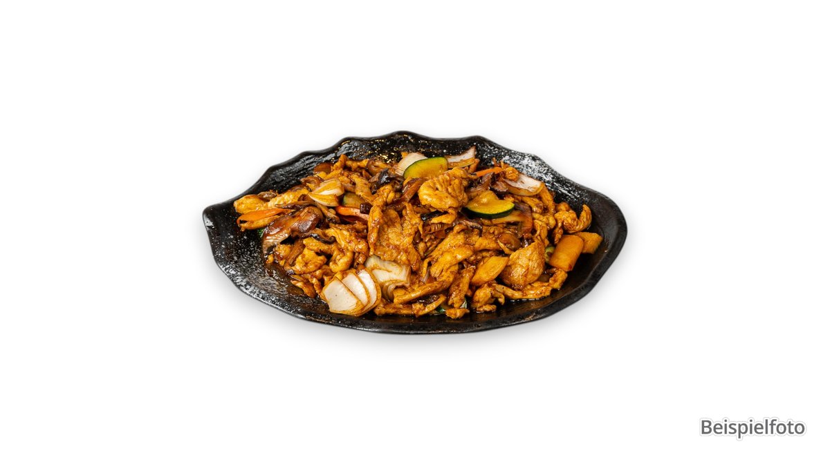 mit Hähnchenstücken, Ananas, Käse und Currysoße