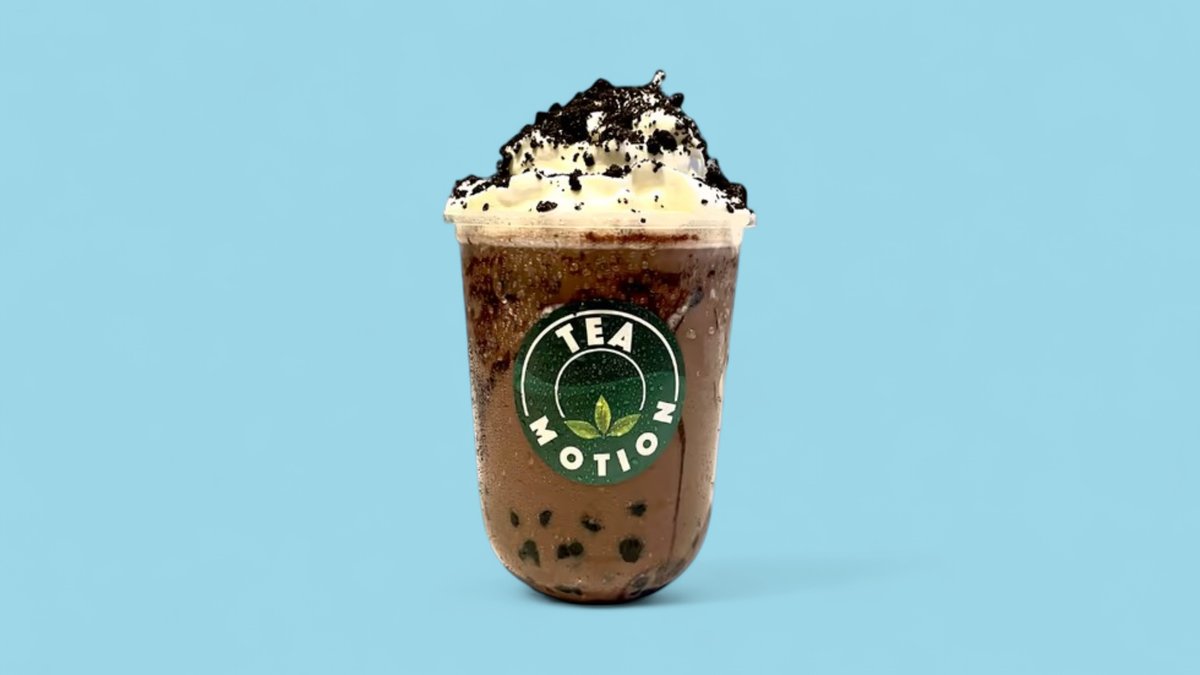 Smoothie mit Oreo-Keksen. Mit Farbstoffen, Konservierungsstoffen und Süßungsmitteln, enthält Milch, enthält Weizen.