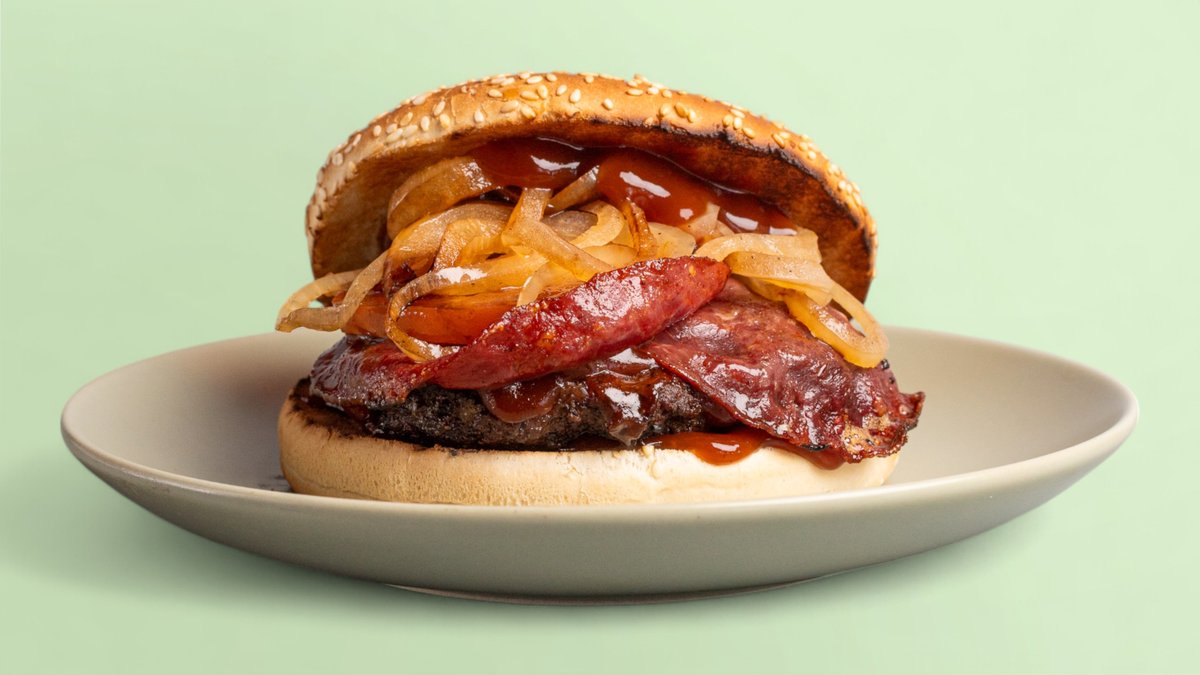 mit 160 g Rindfleischpatty, Pastirma, Tomaten, karamellisierten Zwiebeln und Barbecuesoße