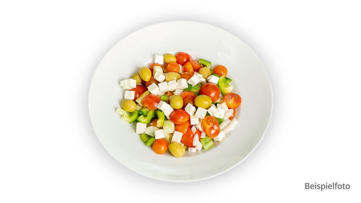 mit frischem Salat, Oliven, Fetakäse, frischem Mais, Tomaten und Gurken