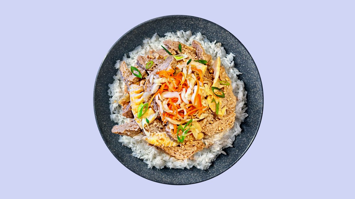 alle Reisgerichte werden mit hausgemachtem asiatischem Krautsalat, Frühlingslauch und Sesam garniert