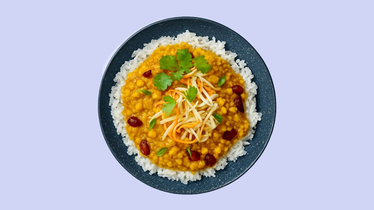 würziges gelbes Curry mit Kichererbsen, Linsen und Kidney Bohnen – optional mit Chicken