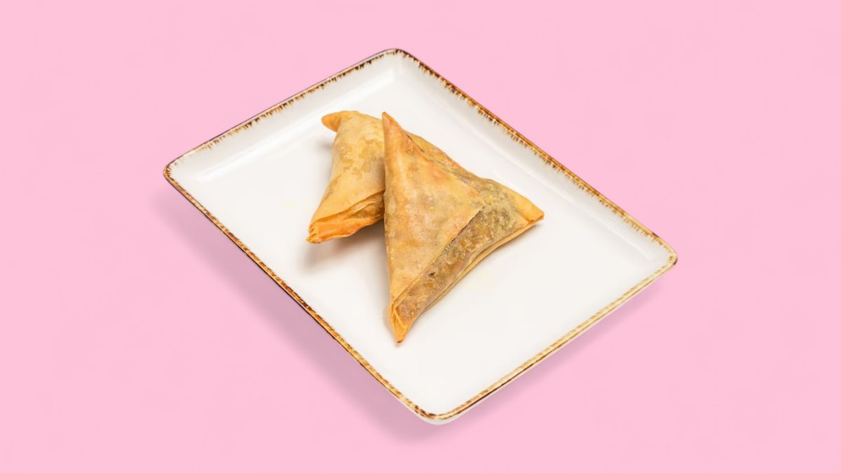 2 Stück mit Soße frittierte Teigtaschen mit Gemüse- oder Rindfleischfüllung, serviert mit hausgemachter Soße deiner Wahl