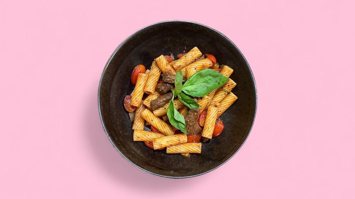leicht pikant, mit Kirschtomatensoße, Petersilie, Olivenöl und Rinderfiletstreifen