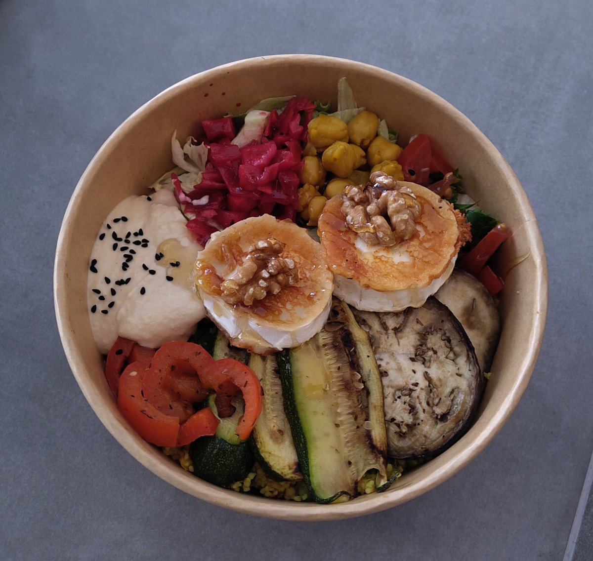 Couscous Salat, Salat, Gegrillte Zucchini und Auberginen, gegrillte Ziegenkäsetaler, Hummus, Kichererbsen, Walnüsse und Honig