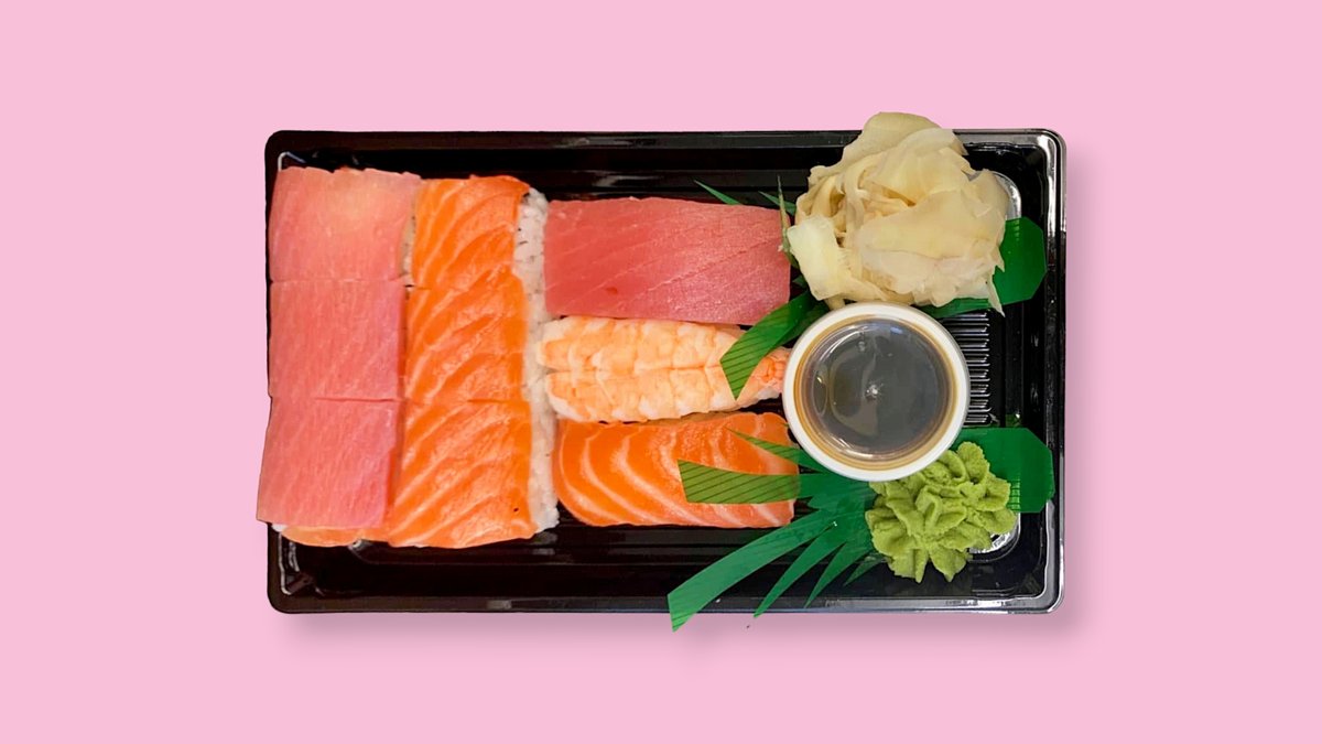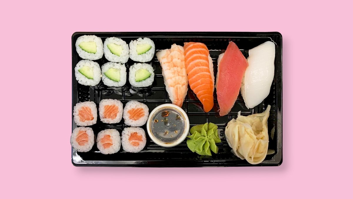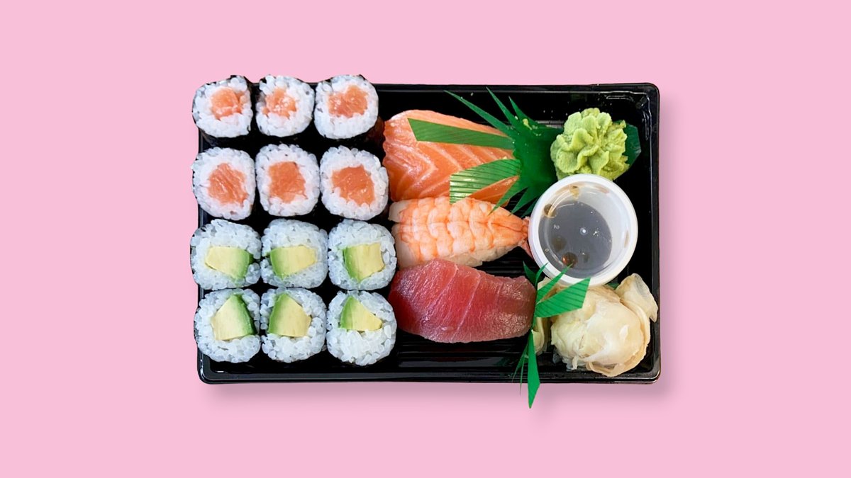 6x Tuna Maki 6x Lachs 6x California Maki 3x Scheiben Tuna 3x Scheiben Lachs 20x Nigiri: verschiedene Sorten