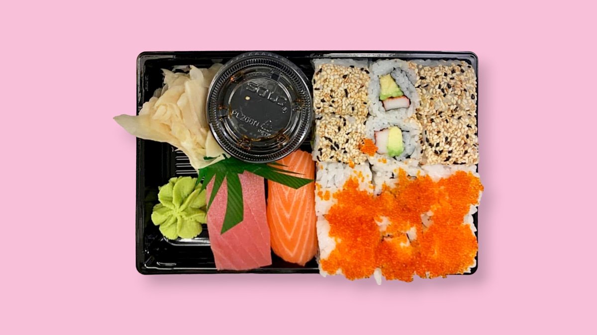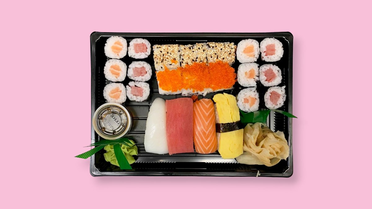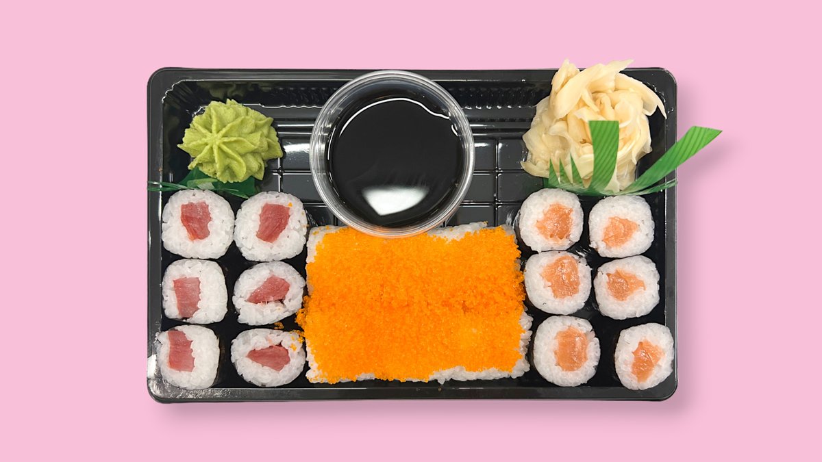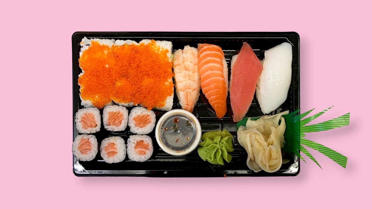 6x Tuna Maki 6x Lachs Maki 6x California Maki 5x Nigiri: Tuna Nigiri, Lachs Nigiri, Scampi Nigiri, Oktupus Nigiri und Eierstich Nigiri 3x Temaki: Tuna Temaki, Lachs Temaki, California Temaki