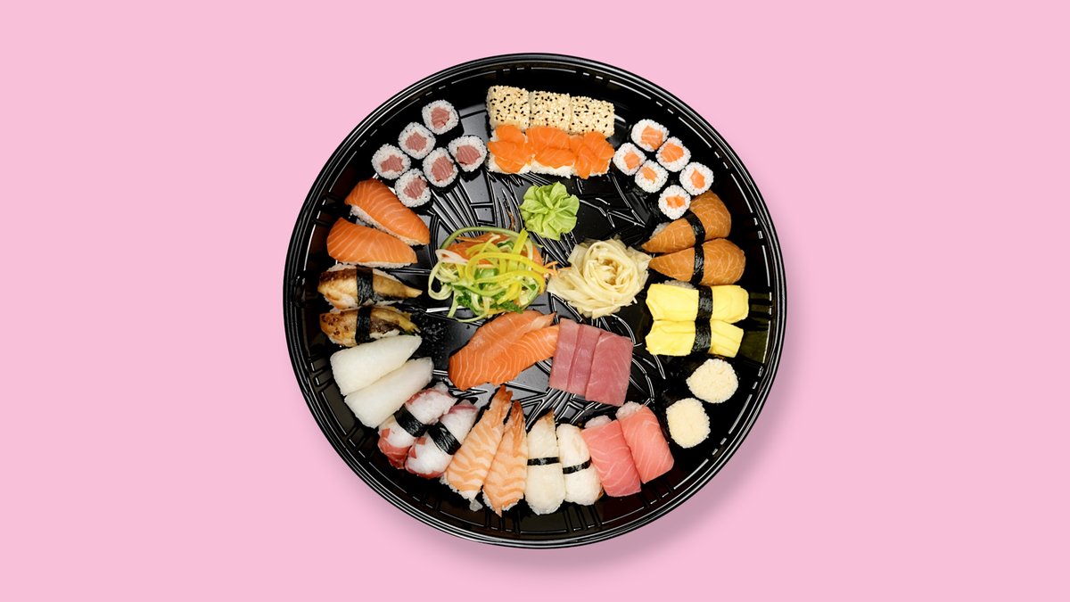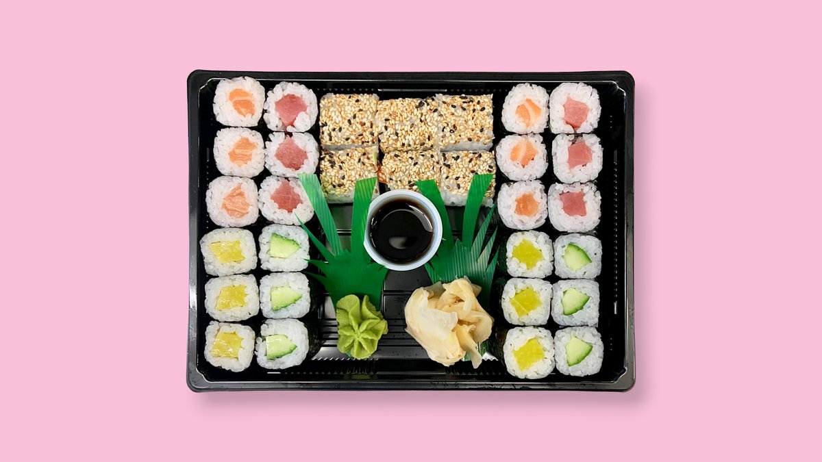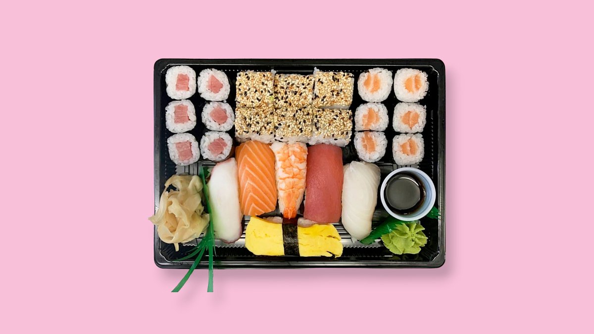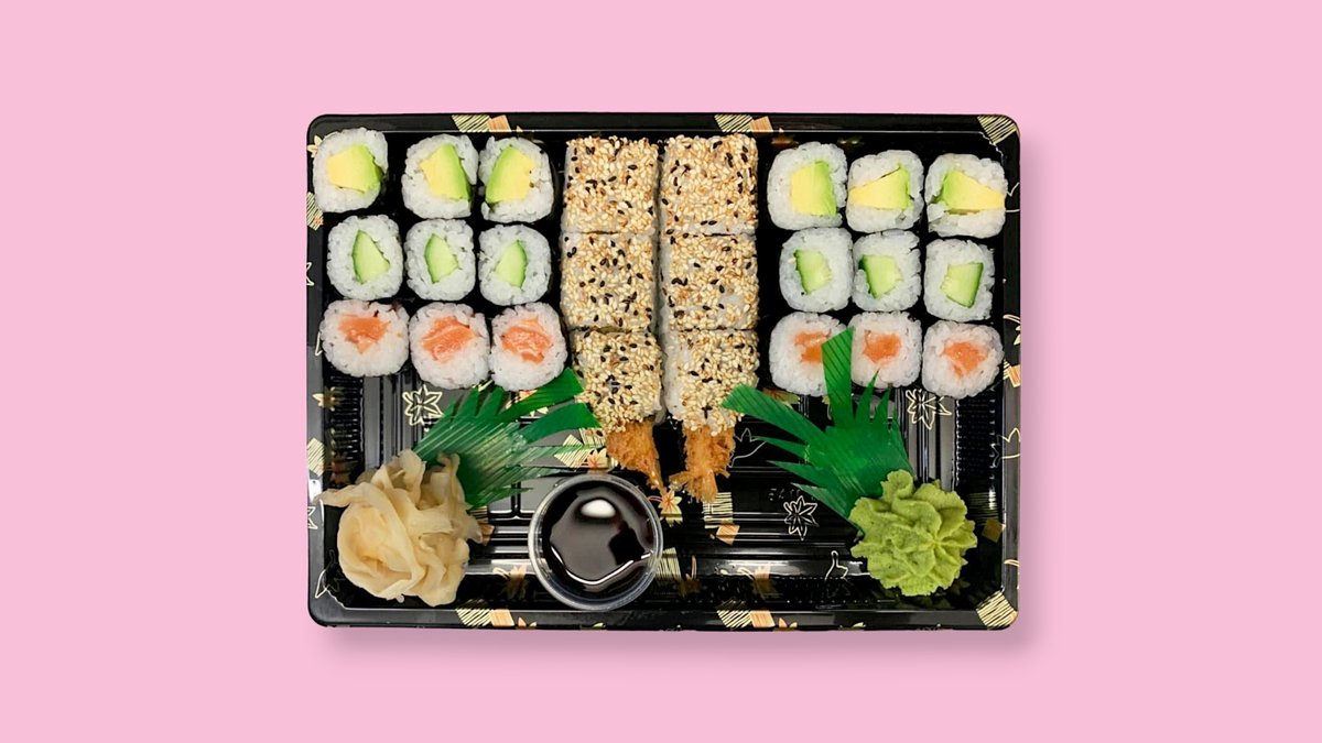 6x Tuna Maki 6x Lachs Maki 6x California Maki 5x Nigiri: Tuna Nigiri, Lachs Nigiri, Scampi Nigiri, Oktupus Nigiri und Eierstich Nigiri 3x Temaki: Tuna Temaki, Lachs Temaki, California Temaki