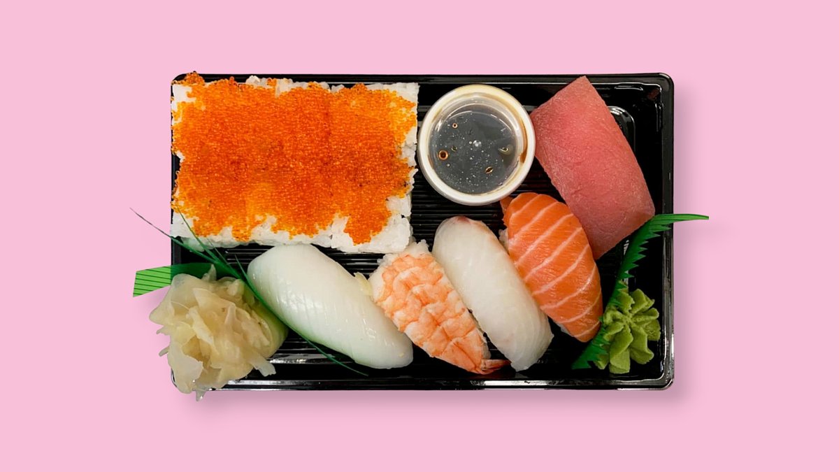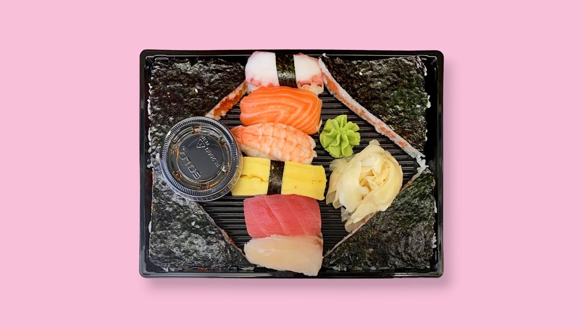 2x Lachs Sandwich 2x Fisch Rogen Sandwich 6x Nigiri: Tuna Nigiri, Lachs Nigiri, Scampi Nigiri, Oktopus Nigiri, Weißfisch Nigiri und Eierstich Nigiri