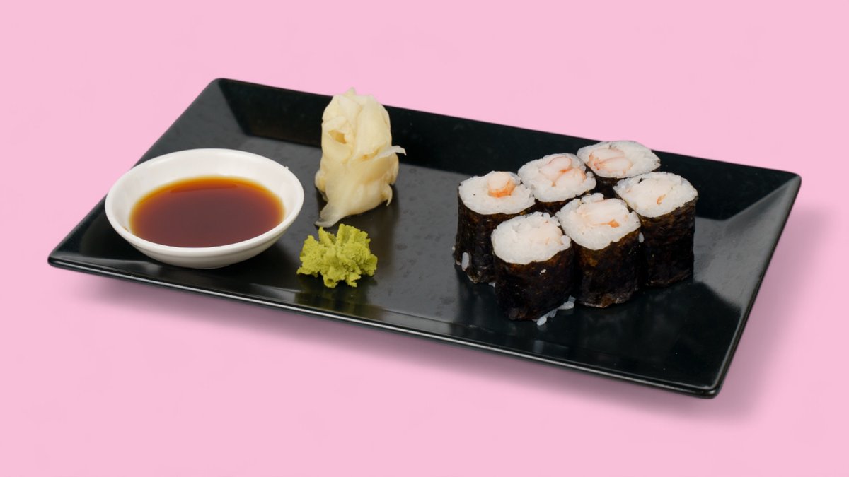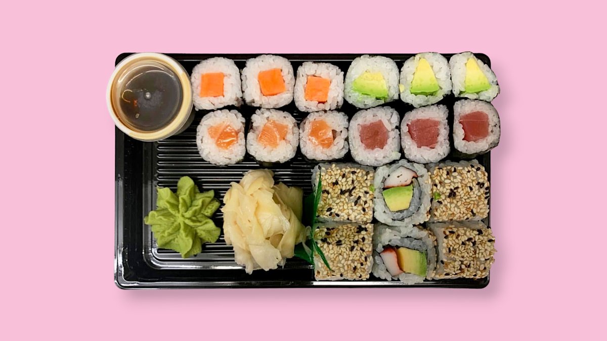 6x Lachs Maki 6x Gurken Maki 4x Nigiri: Lachs Nigiri, Tuna Nigiri, Tintenfisch Nigiri und Ebi Nigiri