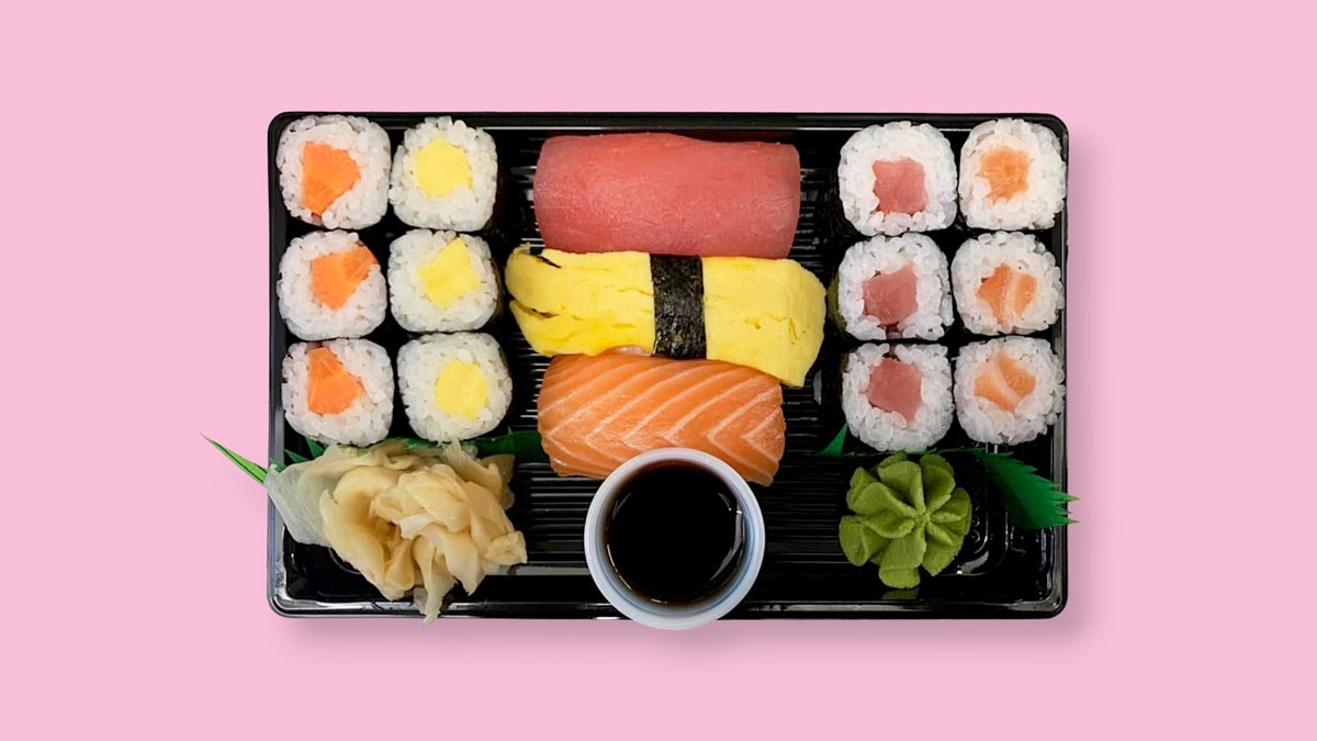 6x Tuna Maki 6x Lachs Maki 6x California Maki 6x Nigiri: Tuna Nigiri, Lachs Nigiri, Scampi Nigiri, Sepia Nigiri Weißfisch Nigiri und Eierstich Nigiri