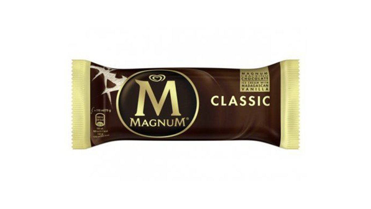 Vanilleeis, umhĂĽllt von knackiger Magnum-Milchschokolade Das Gericht wurde mit Schokolade zubereitet und kann Spuren von NĂĽssen enthalten