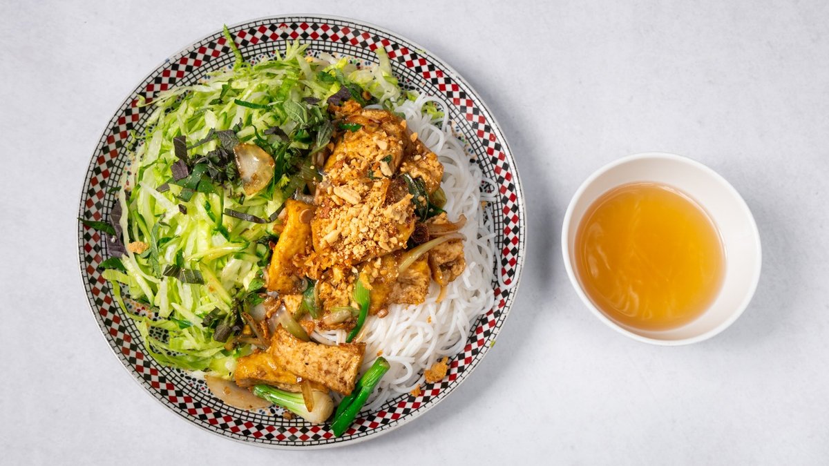 mit einer Zutat deiner Wahl, Reisnudeln, frischem Salat, Kräutern und Limetten-Chili-Dressing