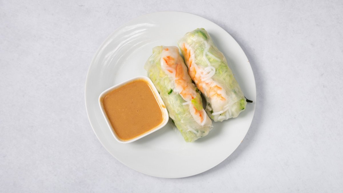 frische Rollen aus Reiscrepe gefüllt mit Reisnudeln, Salat, vielen frischen Kräutern und mit einer Zutat nach Wahl