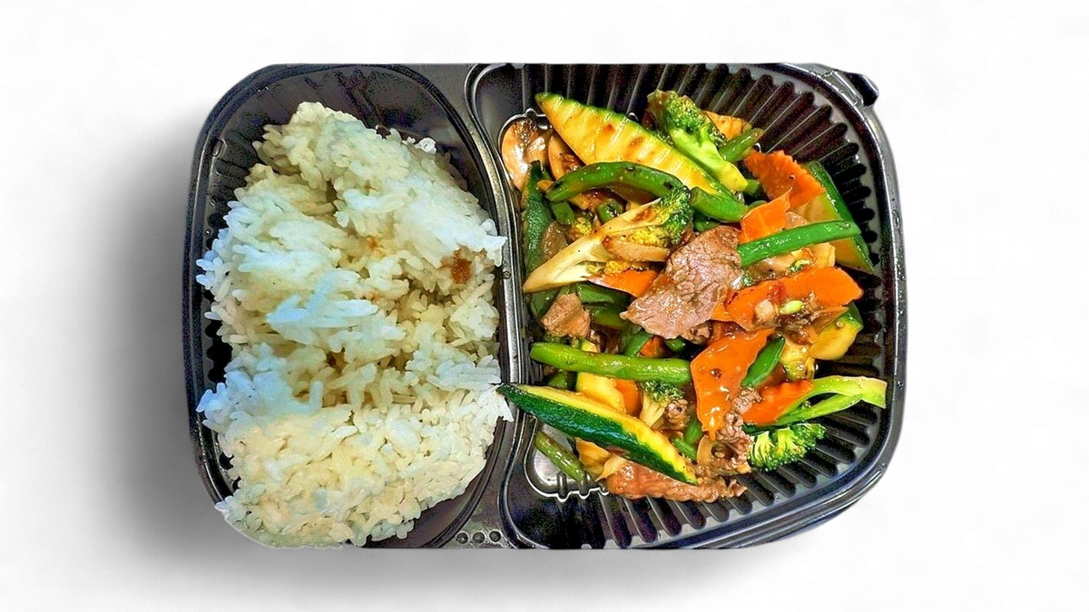 mit einer Zutat deiner Wahl, rotem Thai-Curry und marktfrischem Gemüse