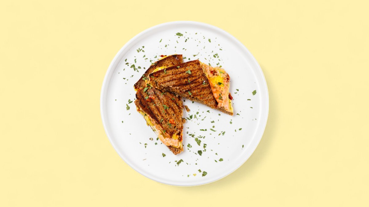 geröstetes Brot mit Frischkäse bestrichen und mit einem großen Gemüseomelette (aus drei Eiern und gerettetem Gemüse) belegt