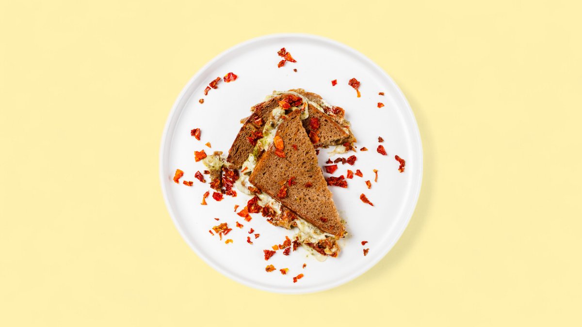zwei Scheiben Brot gefüllt mit viel geschmolzenem leckeren Cheddar , dazu Pesto und Frischkäse