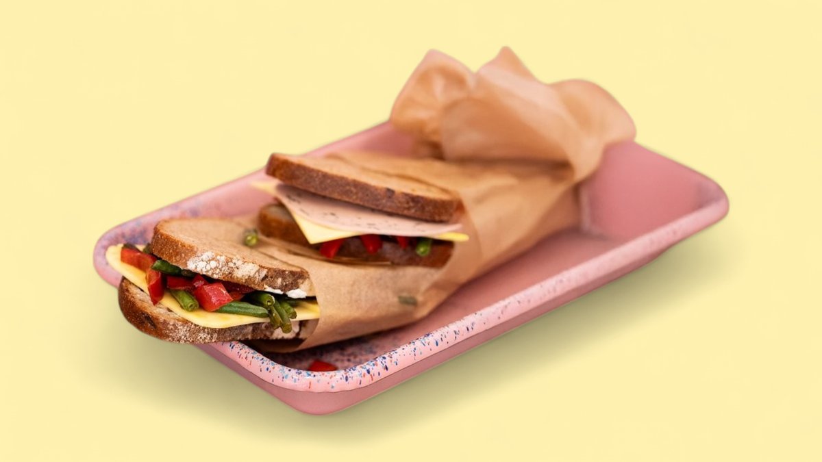 mit drei Scheiben Roggenbrot, veganer Mayo, veganem Hühnchen, veganem Bacon und gerettetem Gemüse des Tages