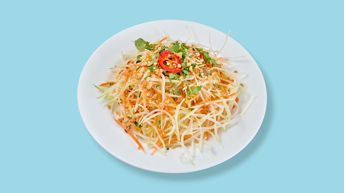 mit grüner Papaya, Karotten, Erdnüssen, Röstzwiebeln, Koriander und Limetten