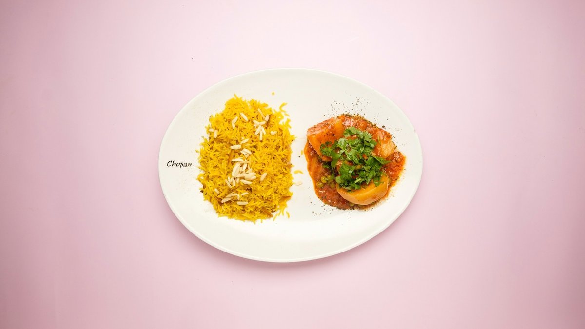 mit gebackenem Basmatireis, Zimt, Nelken, Lorbeer, Cumin, Kardamom, Sternanis und einer Beilage deiner Wahl