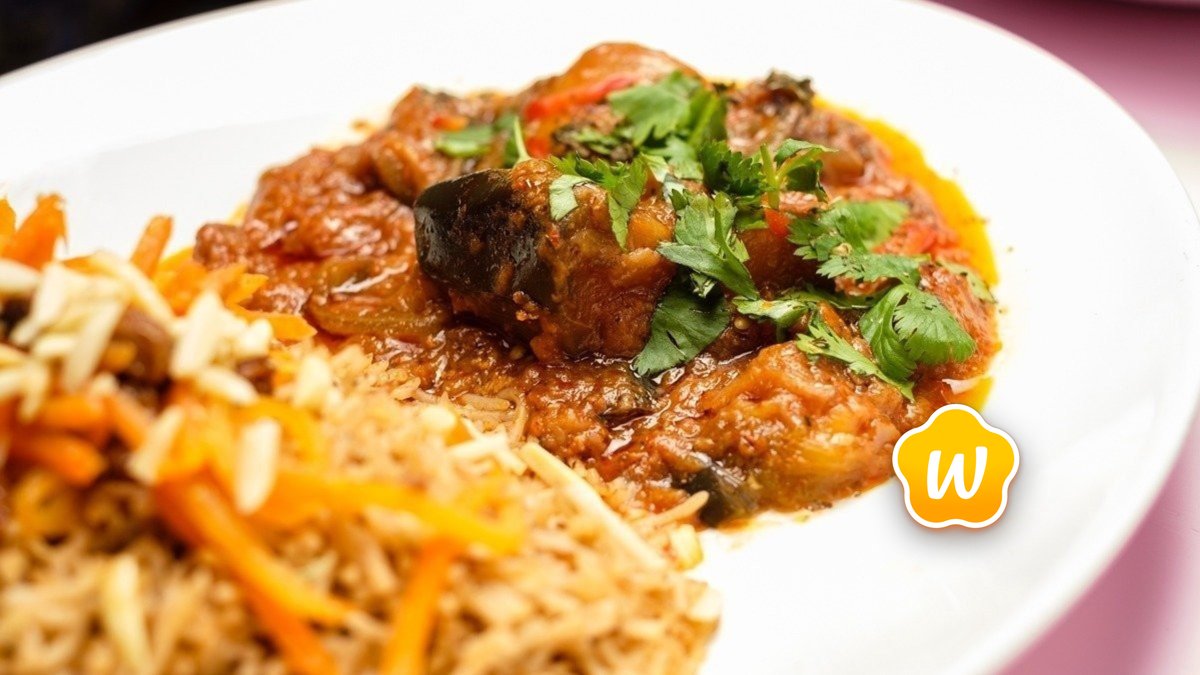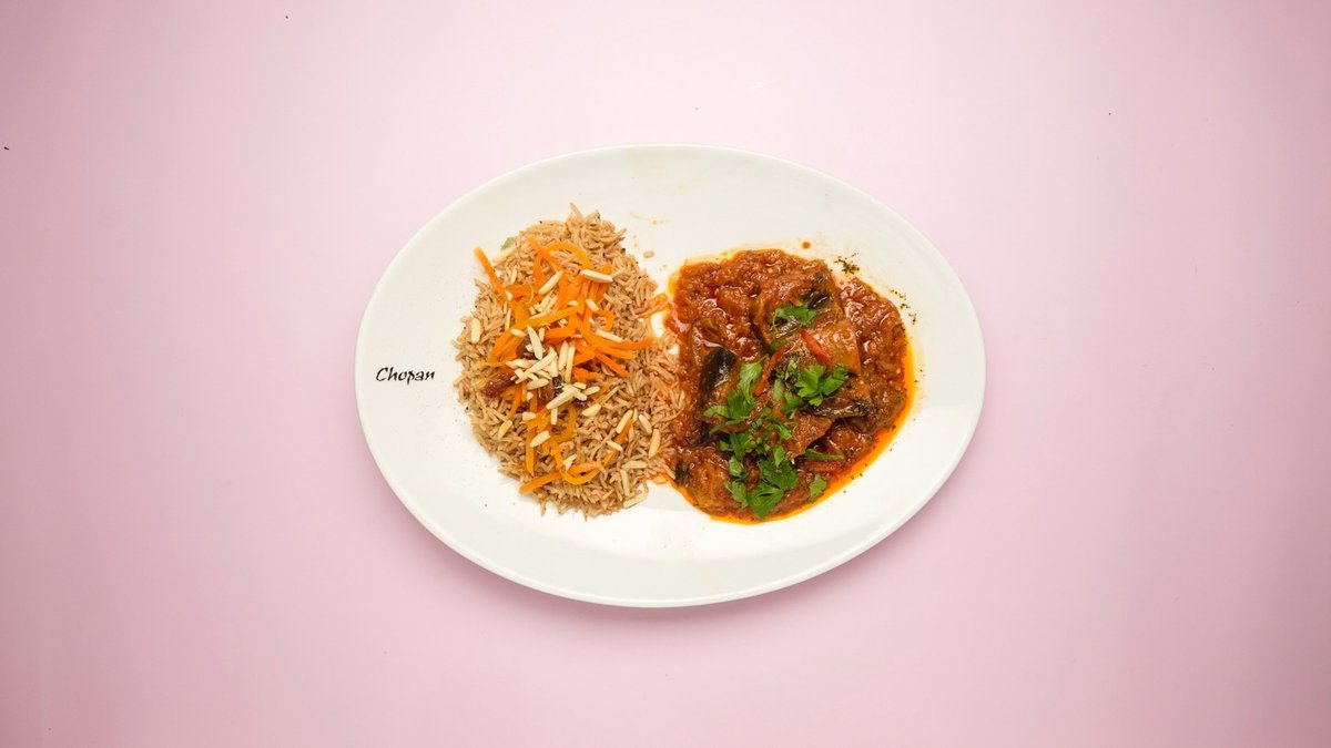 mit Auberginen, pikanter Soße und gebackenem Basmatireis