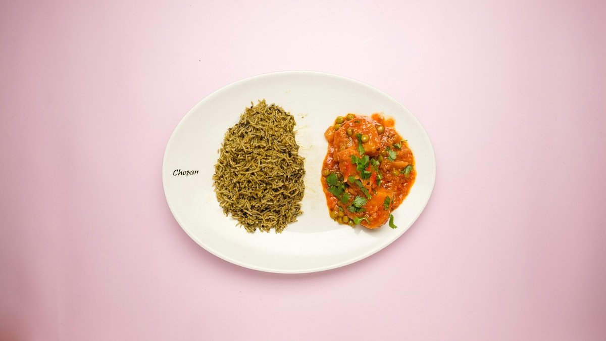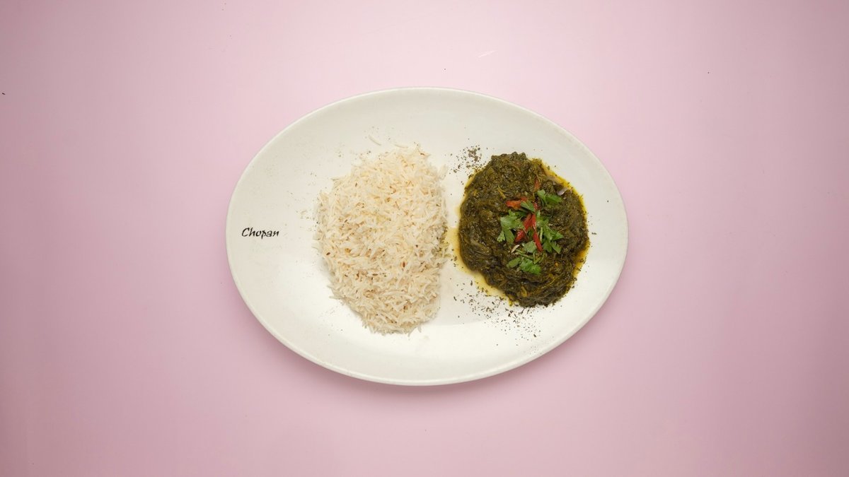mit Spinat mit Bockshornklee, Lauch, Kardamom und gebackenem Basmatireis