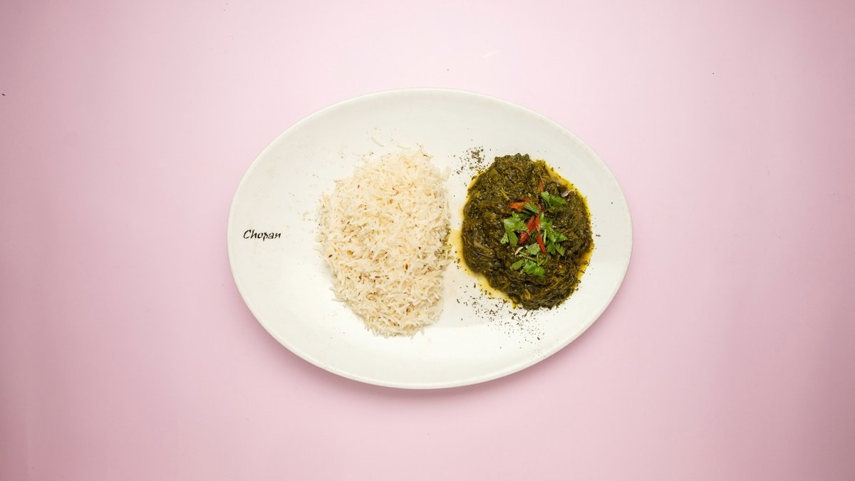 Spinat mit Bockshornklee, Lauch, Kardamom und gebackenem Basmatireis