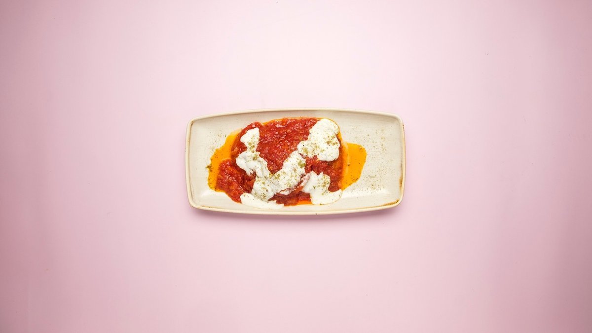 gebratene Auberginen in Tomaten-Zwiebelnsoße mit cremigem Quarkbett und Fladenbrot
