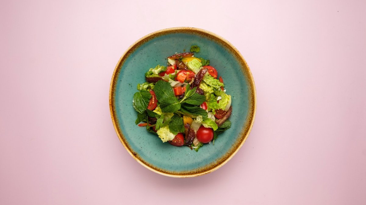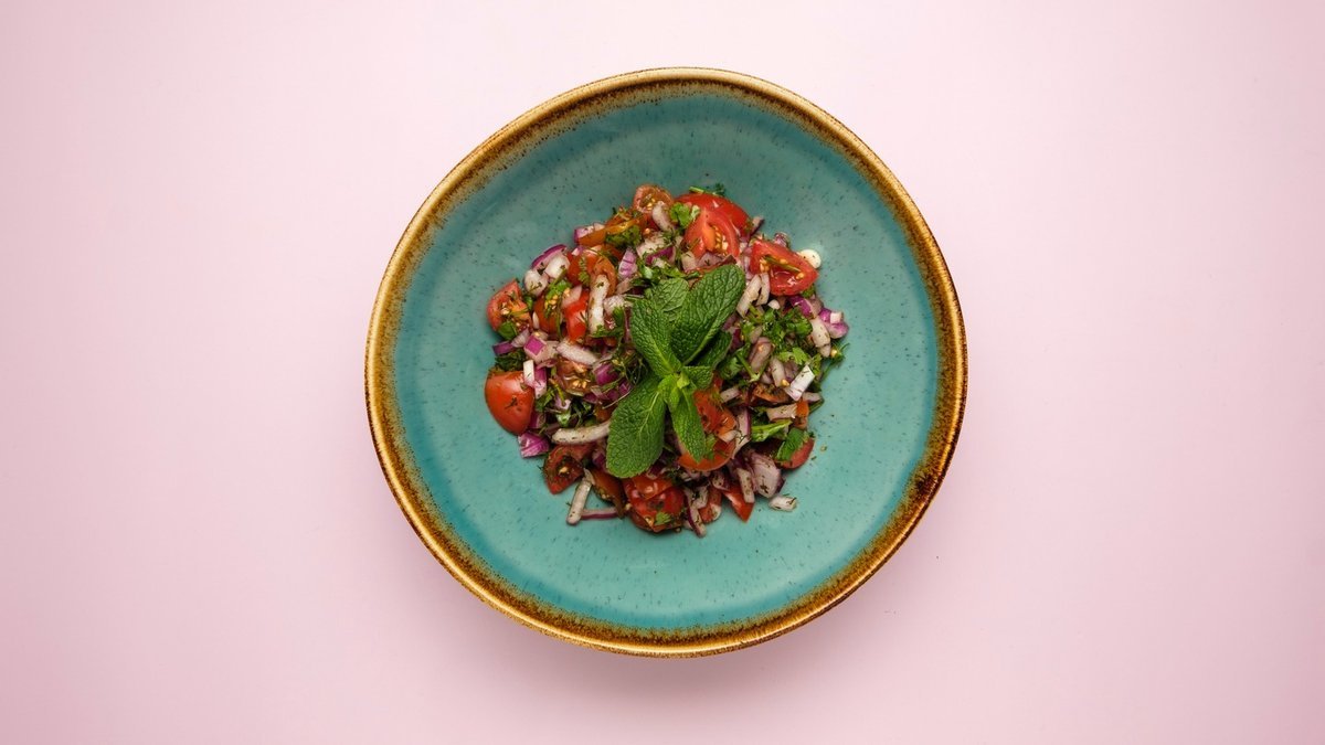 mit Tomaten, Zwiebeln, Koriander und frischer Minze