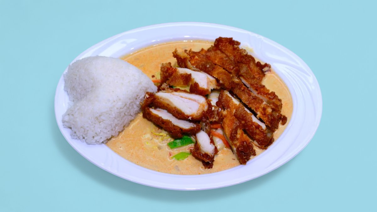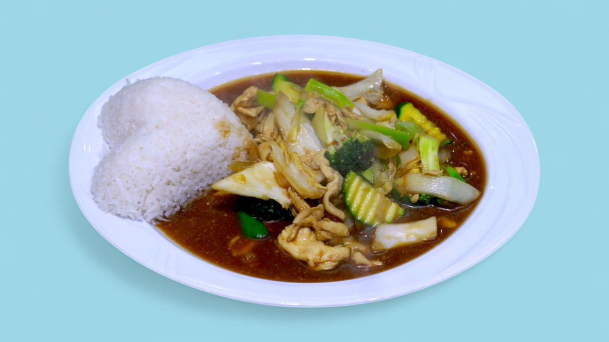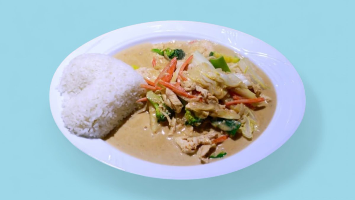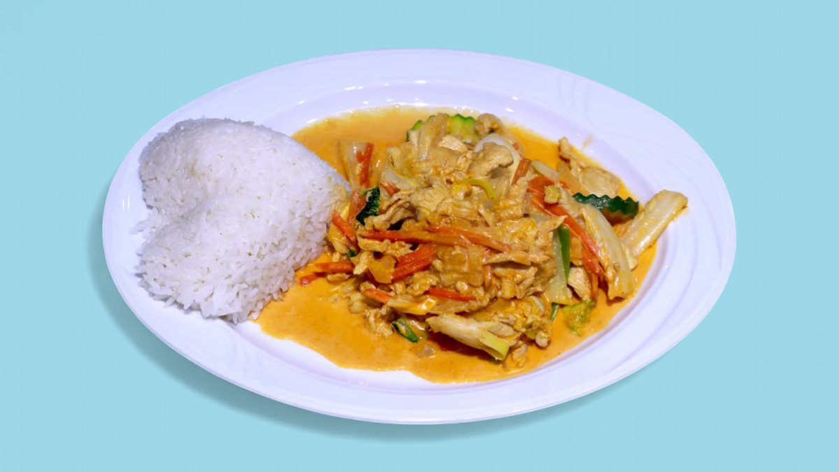 alle Gerichte werden mit Hähnchen, Gemüse und Reis zubereitet