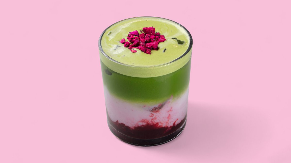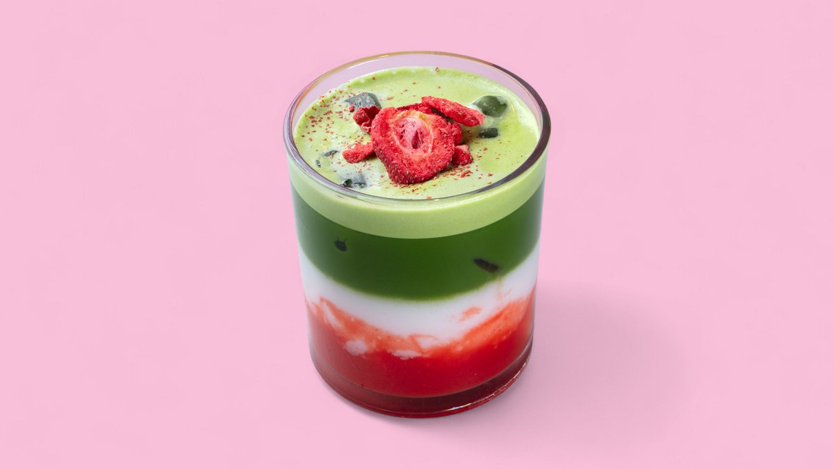 Ein Getränk, das den erdigen Geschmack von Matcha mit der süßen Fruchtigkeit von Erdbeeren kombiniert.