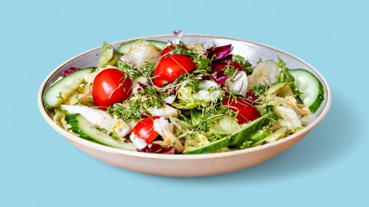 Frischer gemischter Blattsalat, Karotte, Tomate, Gurke, Salatkerne, hausgemachtes Balsamico-Senf-Dressing
