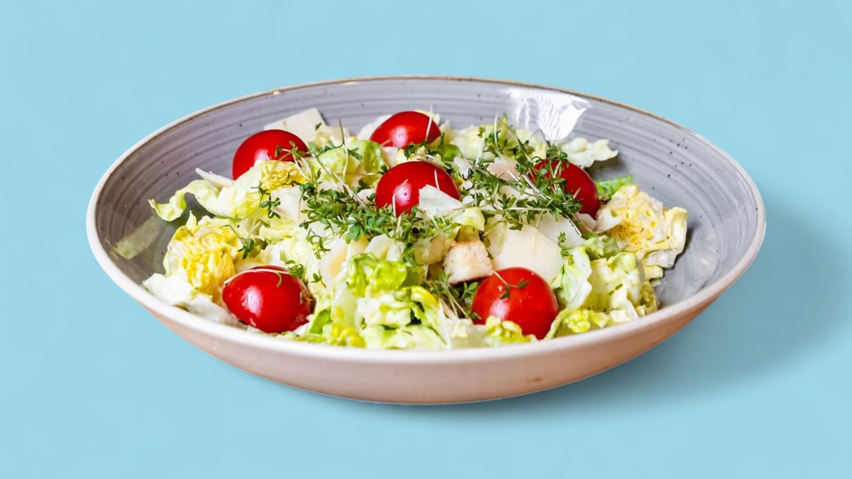 Knackiger Romanasalat, Parmesan, Tomate, hausgemachte Croûtons, hausgemachtes Caesar Dressing