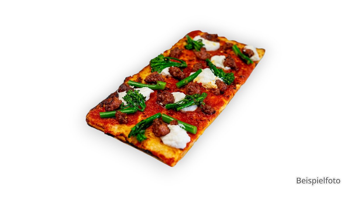 alle Pizzen sind ca. Ø 40 cm groß und werden mit Tomatensoße und Mozzarella zubereitet („79. Pizza Mortadella” und „77. Pizza Patata Tartufo” werden ohne Tomatensoße zubereitet)