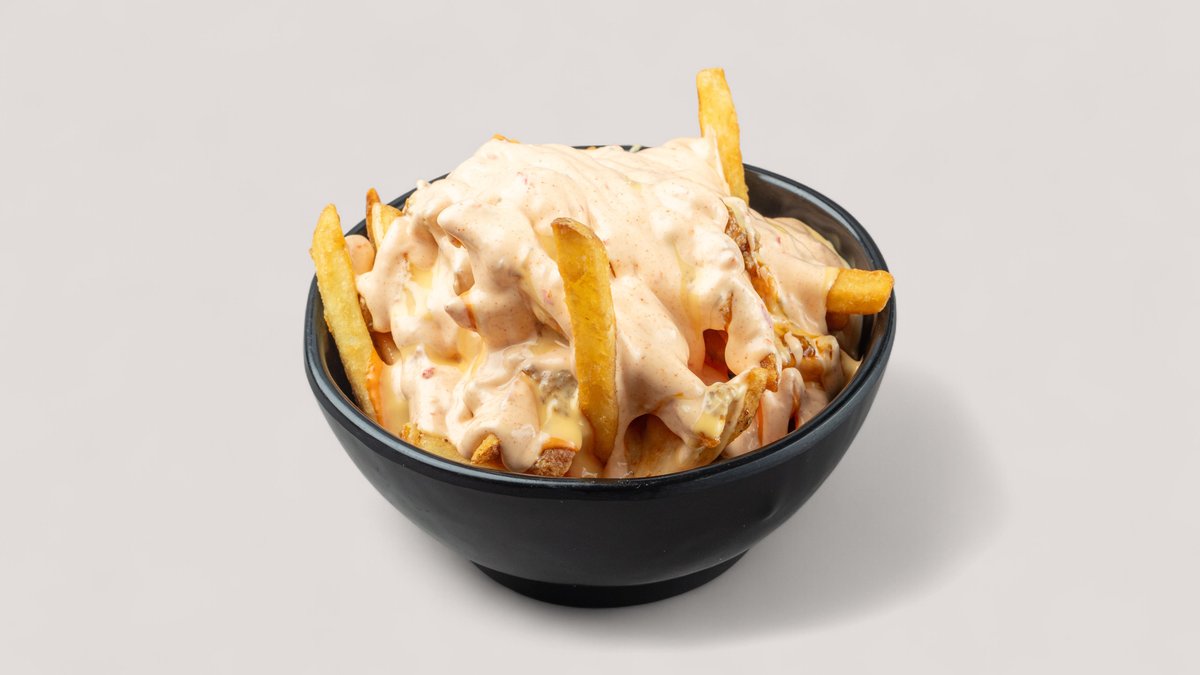 mit Pommes frites, Handcut-Pommes frites, Süßkartoffel-Pommes, einem Salat deiner Wahl, Hähnchenfleisch, Eddy's-Grillhaussoße, Tomaten, Salat, Zwiebeln und Grillgemüse